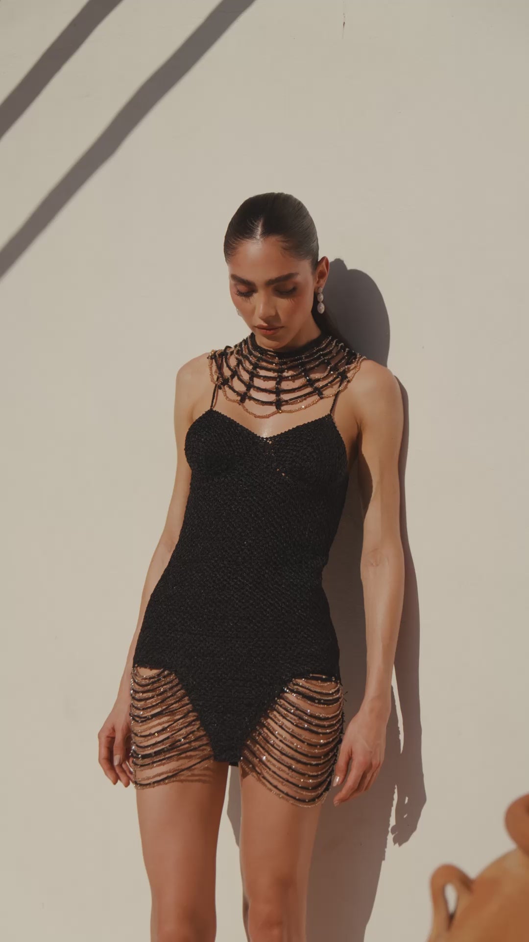 Utilize o Vestido Eclipse com o Colar Eclipse com sandálias de salto fino, scarpin, bota ou rasteira.