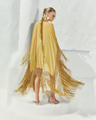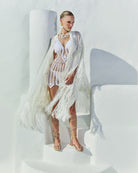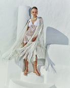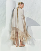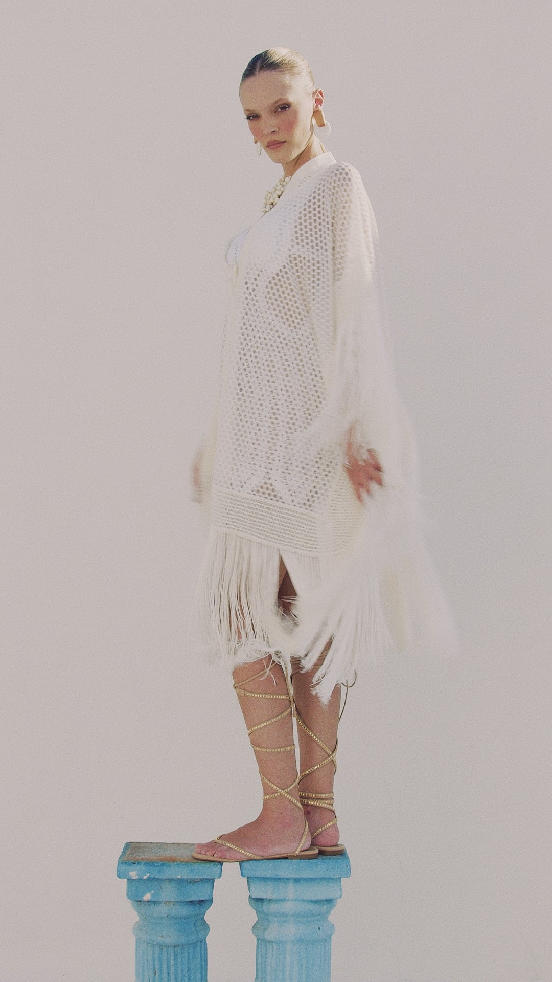 Kimono de ganchillo y muselina de seda con detalle de ganchillo por todo el contorno, aberturas en los laterales y remate de flecos. El Kimono tiene amarre frontal a la cintura y sujeta la pieza. El Kimono es ideal para usarlo como superposición en ocasiones urbanas o después de la playa, ya que tiene un tacto ligero y una apariencia fluida. Kimono hace que todas las producciones sean más sofisticadas y modernas. Tiene excelente ribete y transparencia a la luz.