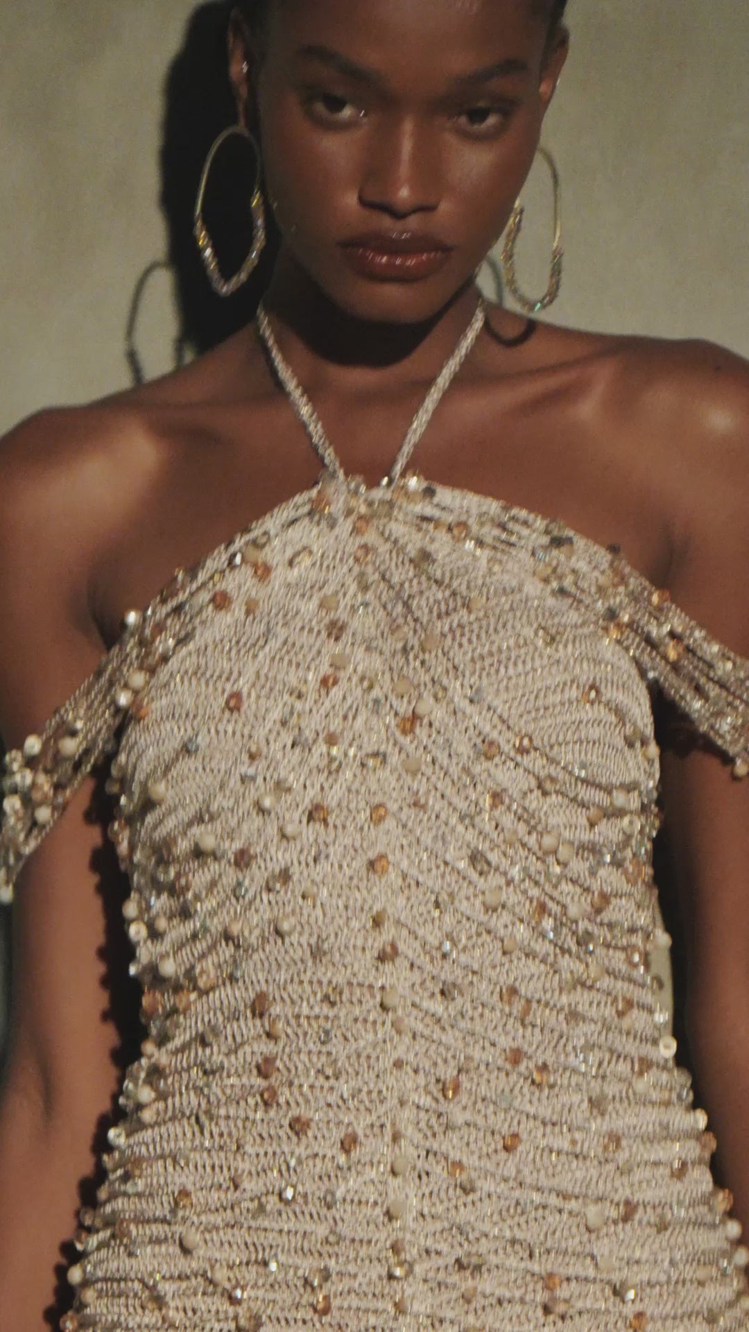 The Cascata Dress has in its DNA the sensuality and elegance of the Ammi woman. A haute couture dress made entirely of fitted crochet with a halter neckline that enhances the curves of the body in a delicate and feminine way. It has crystal chains attached one by one in an exclusive design.