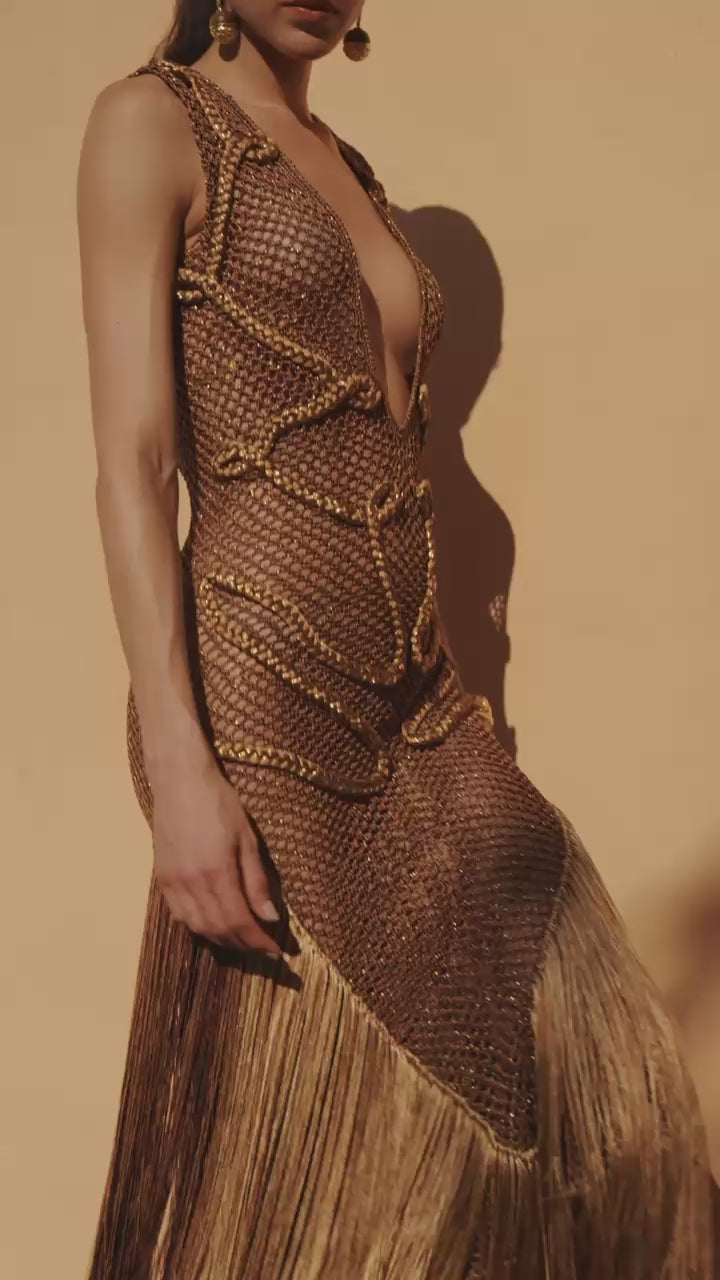 Inspired by Oasis, this dress features a mermaid design with V-shaped fringes that enhance the feminine silhouette in an elegant and sensual way. Designed for women who want to express power, confidence and the entire essence of the Ammi collection.