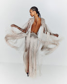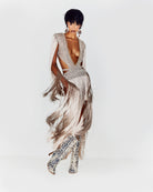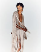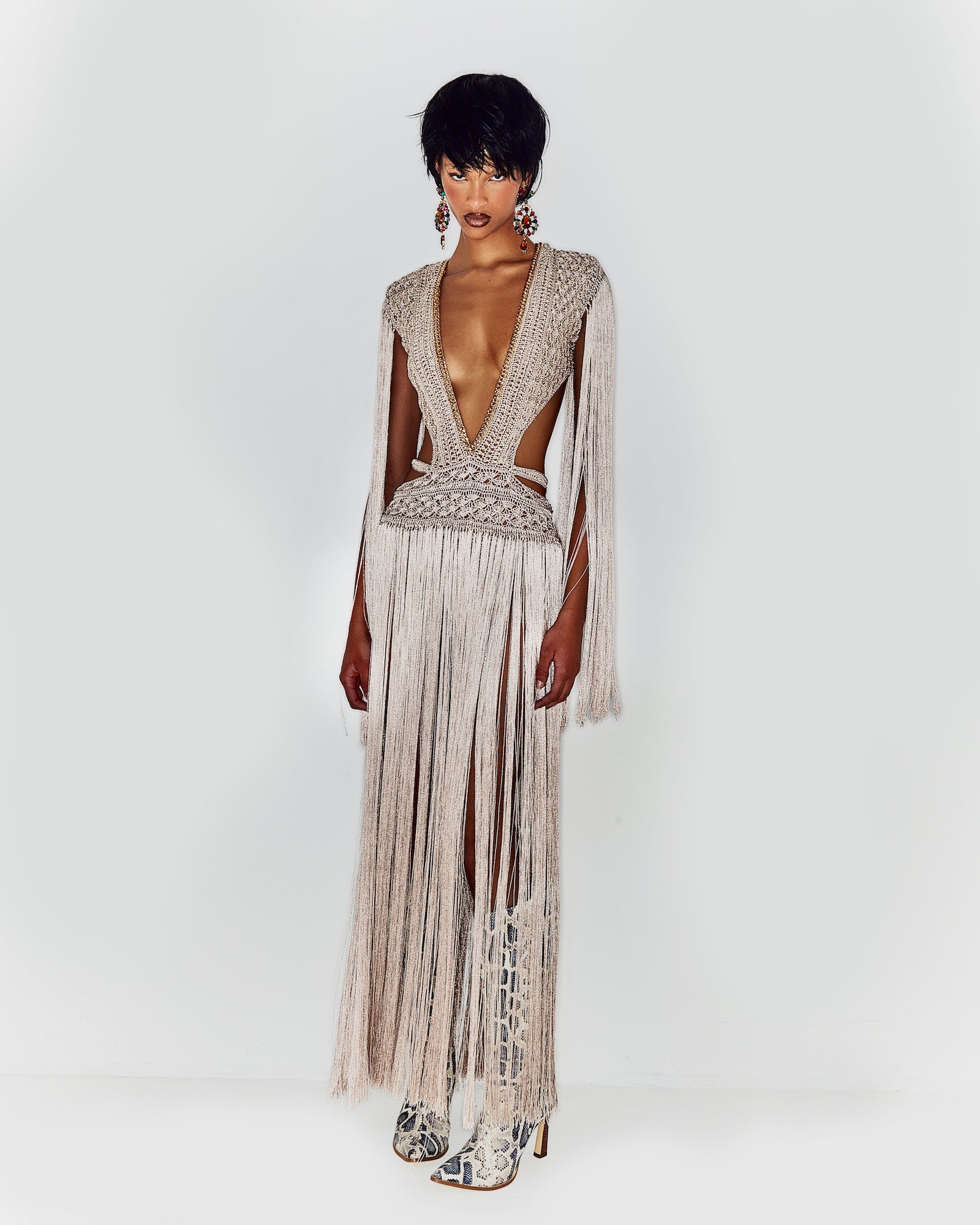 El Vestido Lençóis está elaborado en crochet con hilos metalizados, tiene un modelado body-style con escote pronunciado, rematado con una cadena de oro bañado en oro en el escote, largos flecos aplicados en los hombros y hombreras, detalles huecos en la cintura y cierre de cuello Los flecos se aplican individualmente para un acabado perfecto.