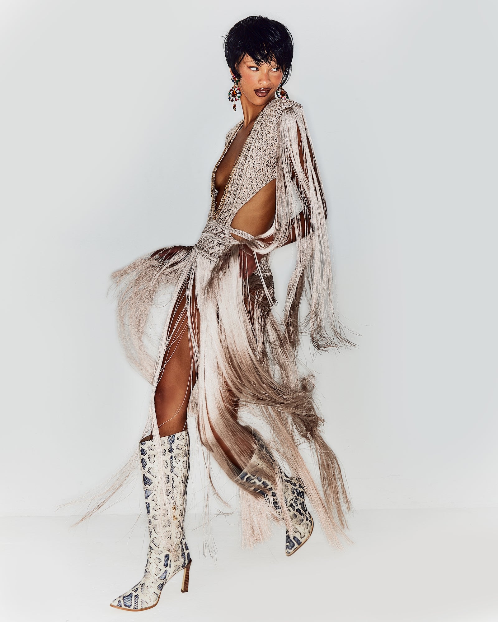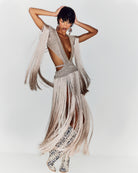 Una pieza de declaración en el guardarropa, el Vestido Lençóis eleva la producción debido a su croché y sus flecos. Apuesta por las botas para rematar, un look trendychic e impactante.